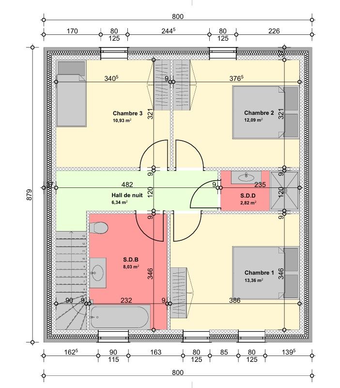 Etage : hall nuit, 3 chambres, salle de bains, salle de douches.