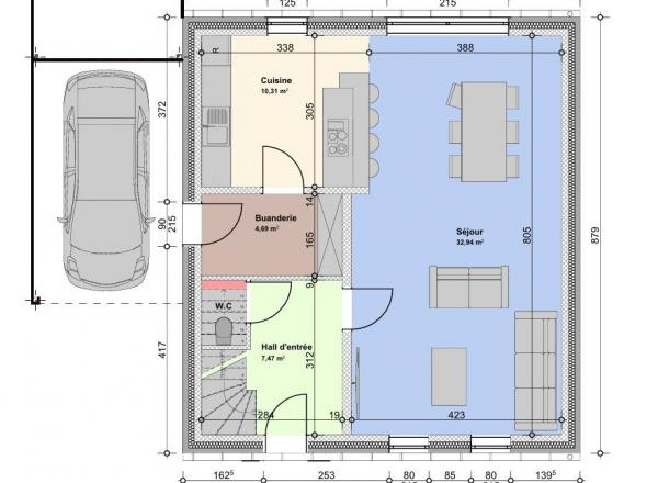 Rez de chaussée : hall, wc, living (33 m²), cuisine, buanderie.