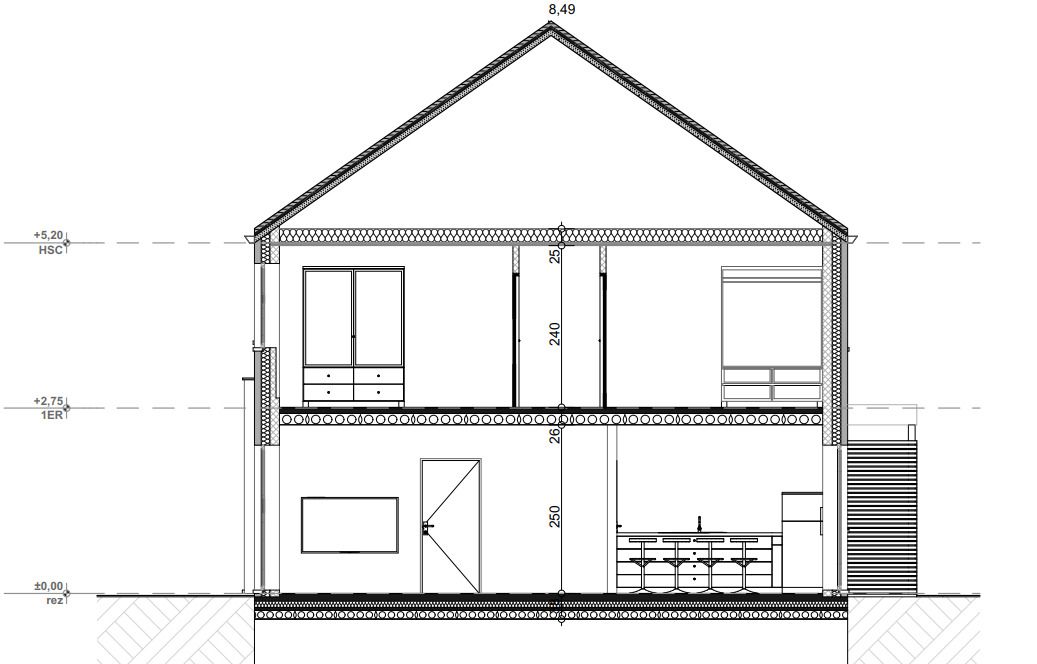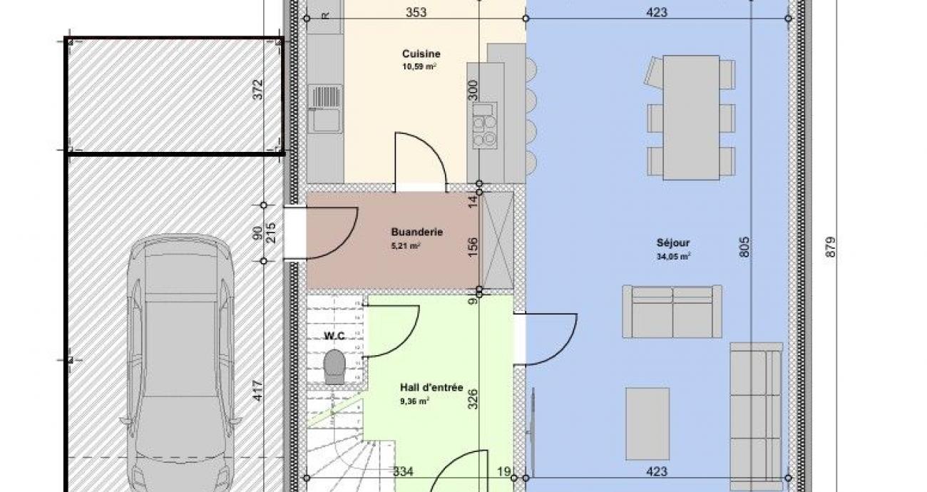 Rez de chaussée : hall, wc, living (33 m²), cuisine, buanderie.