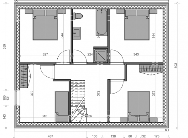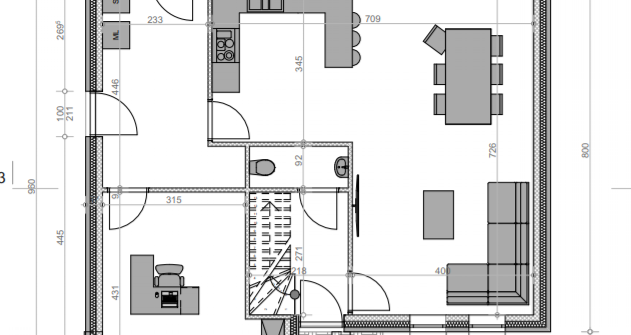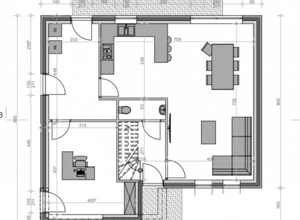 Rez-de-chaussée : hall, wc, living, cuisine, bureau, buanderie.