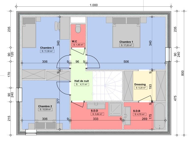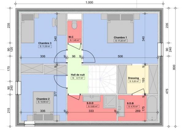 Etage : hall de nuit, 3 chambres dont 1 suite parentale avec dressing et SDB, 2 chambres, SDD.