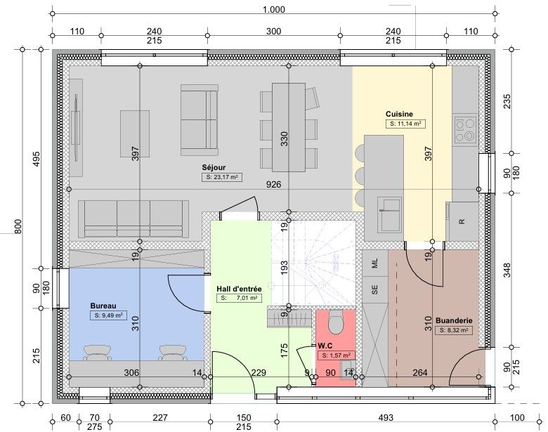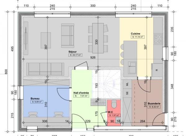 Rez-de-chaussée : hall, wc, living, cuisine ouverte, buanderie, bureau.