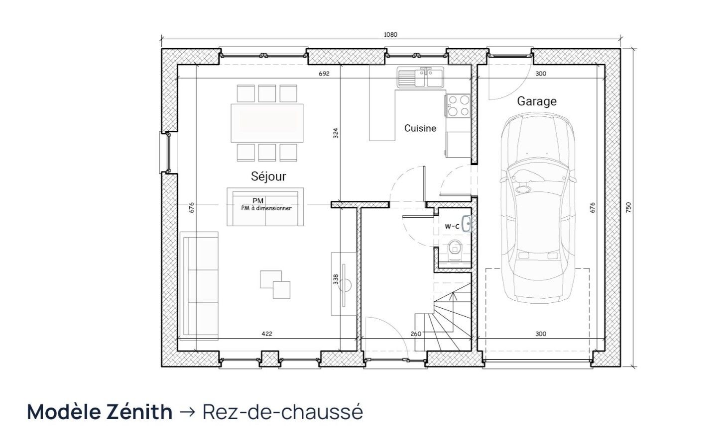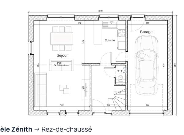 Rez-de-chaussée : hall, wc, living, cuisine ouverte équipée, garage.