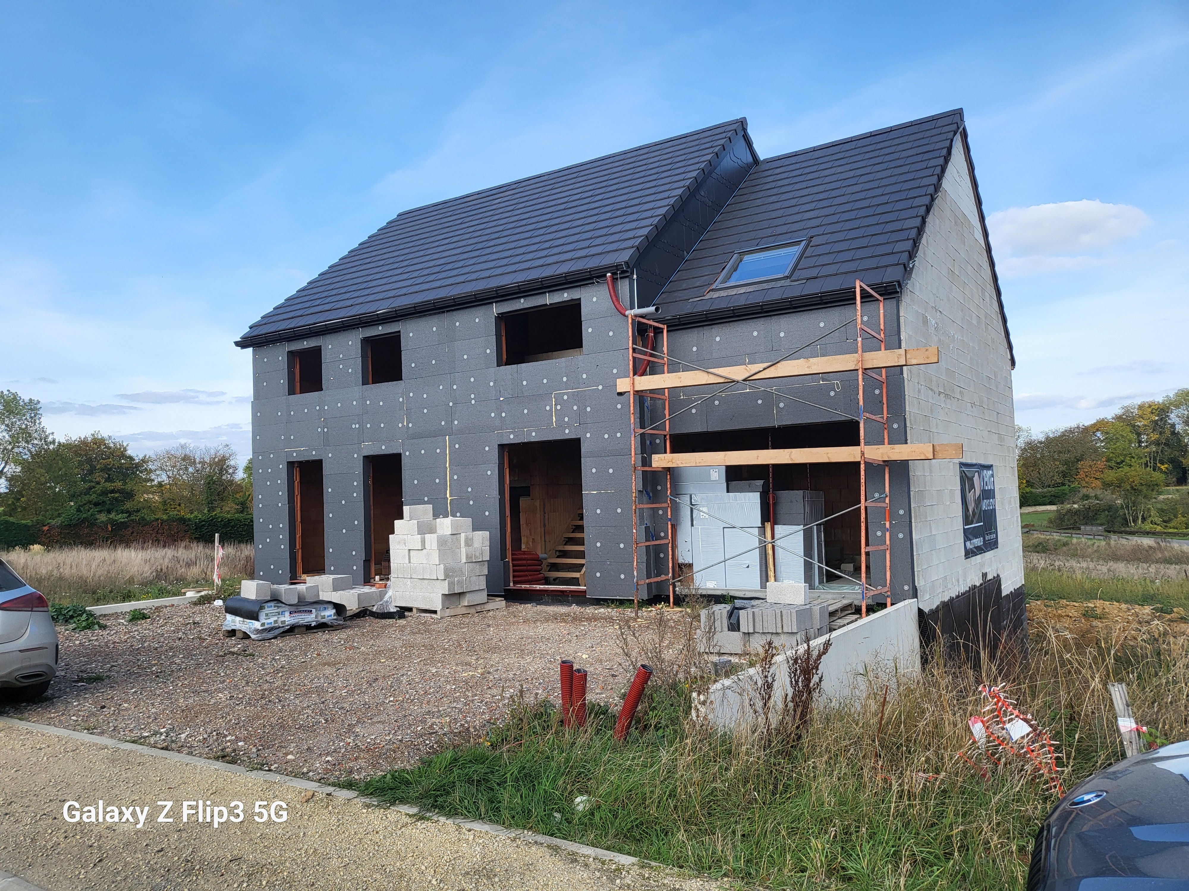 Le TERRAIN + la CONSTRUCTION en cours : le prix du jour est en gros-oeuvre couvert = 269.635,55 €, soit 322.178,12 € provision frais comprise. ................................... En cours de construction. .............................. Convient pour profession libérale. ..................... Surface au sol : 106,82 m² en demi-niveau. Surface totale : 261,55 m².......... Avec caves de 49 m², aménageables en bureaux avec un accès privatif par l'extérieur et aussi avec un accès via l'intérieur de la maison. ....................................... Plans et documents (pdf) en bas de page.