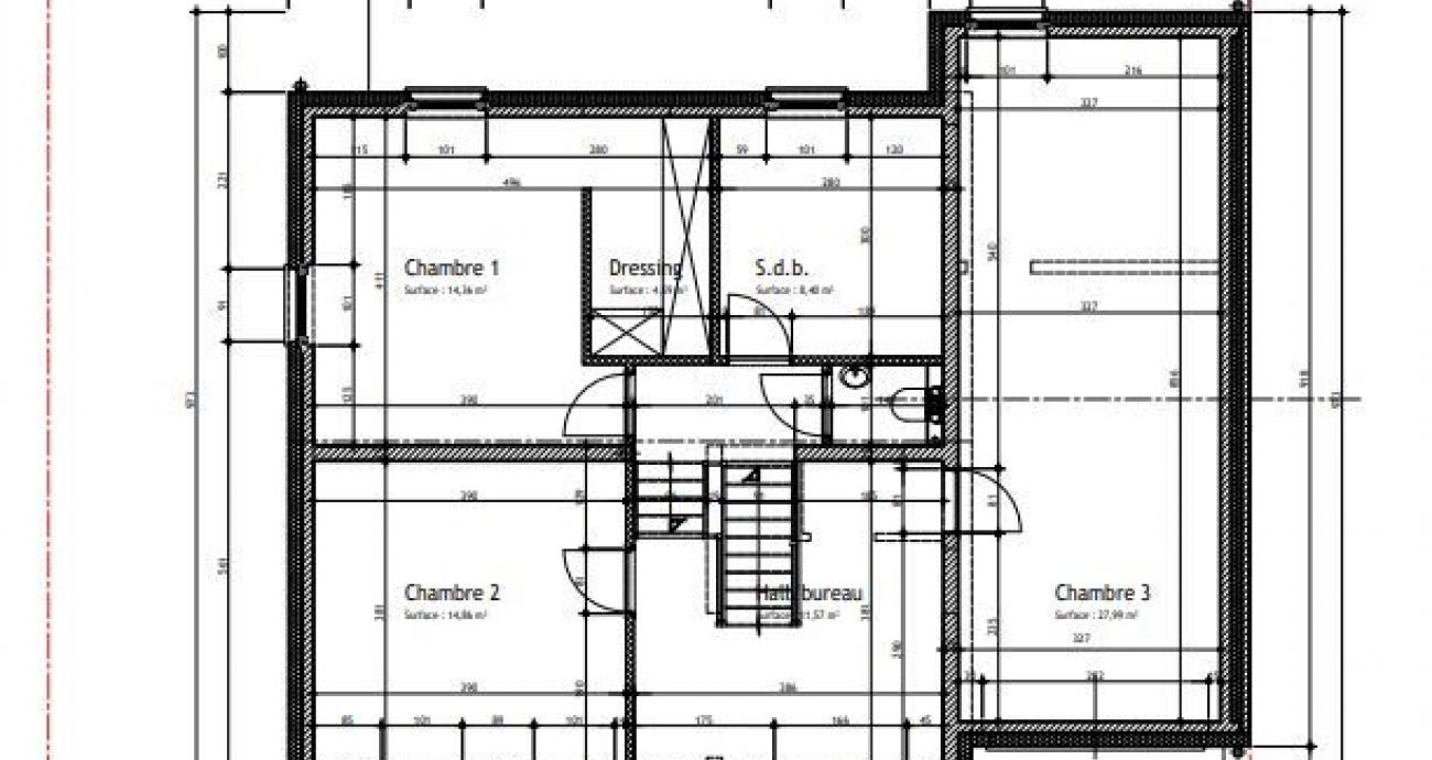 niveau +2,75 : palier/bureau, 2 chambres (14,86 m² et 27,99 m²).
