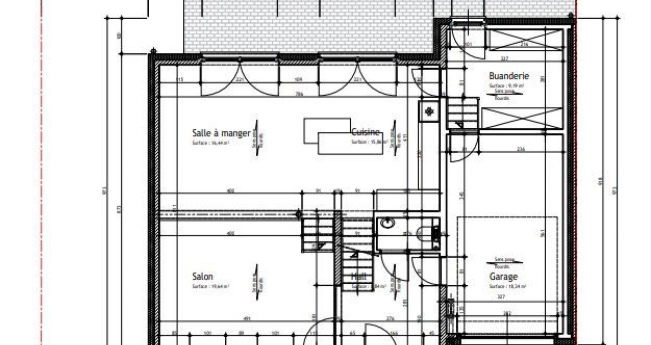niveau - 0,90 : sàm + cuisine (32,50 m²), buanderie (9,19 m²).
