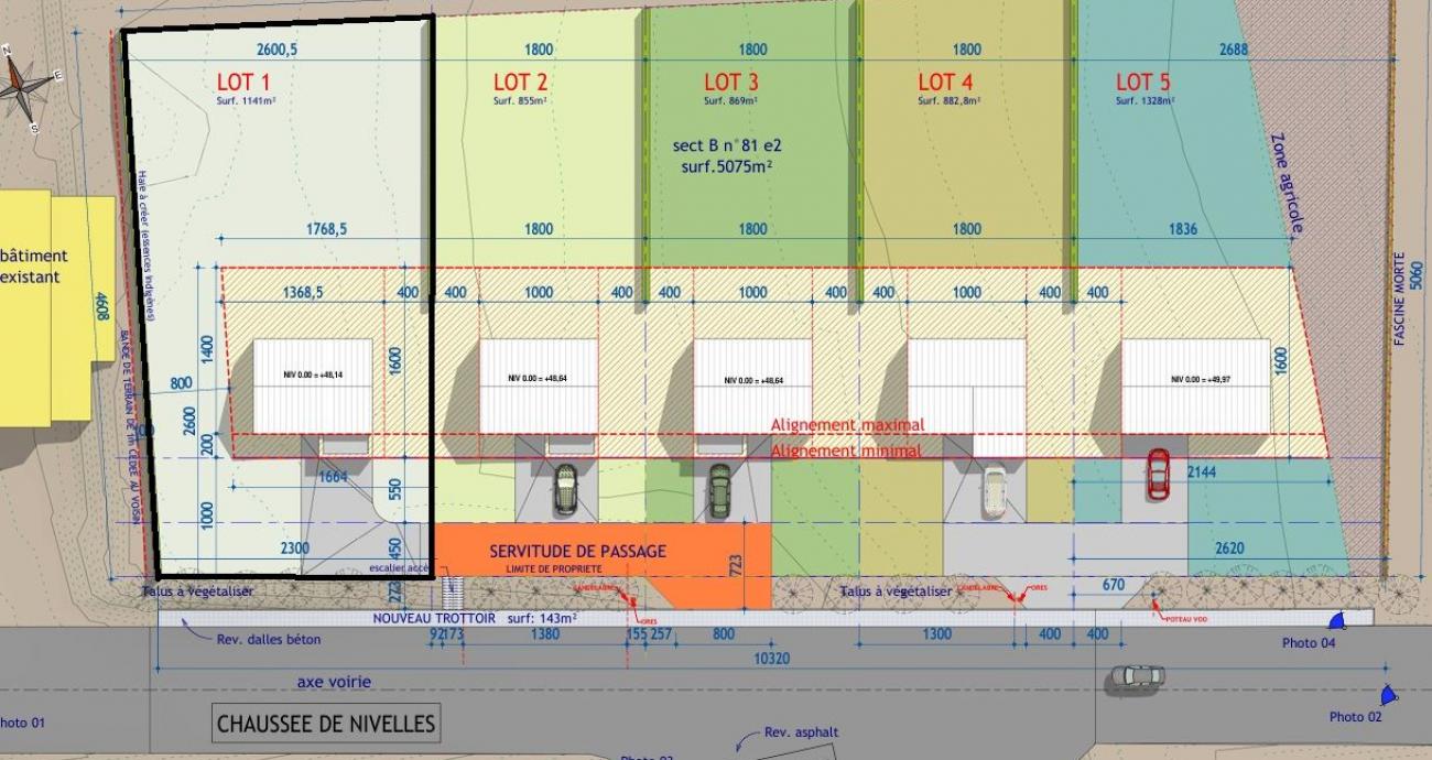(**) PROVISION DES FRAIS : cette provision peut inclure les frais et taxes suivantes : les droits d'enregistrement, la TVA sur la quote-part des travaux de viabilisation, les honoraires d'architecte et de géomètre, les frais notariés d'acte de division et une provision pour les honoraires et frais notariaux calculés sur notaire.be. Veuillez nous contacter pour connaître le détail des frais relatifs au terrain qui vous intéresse.